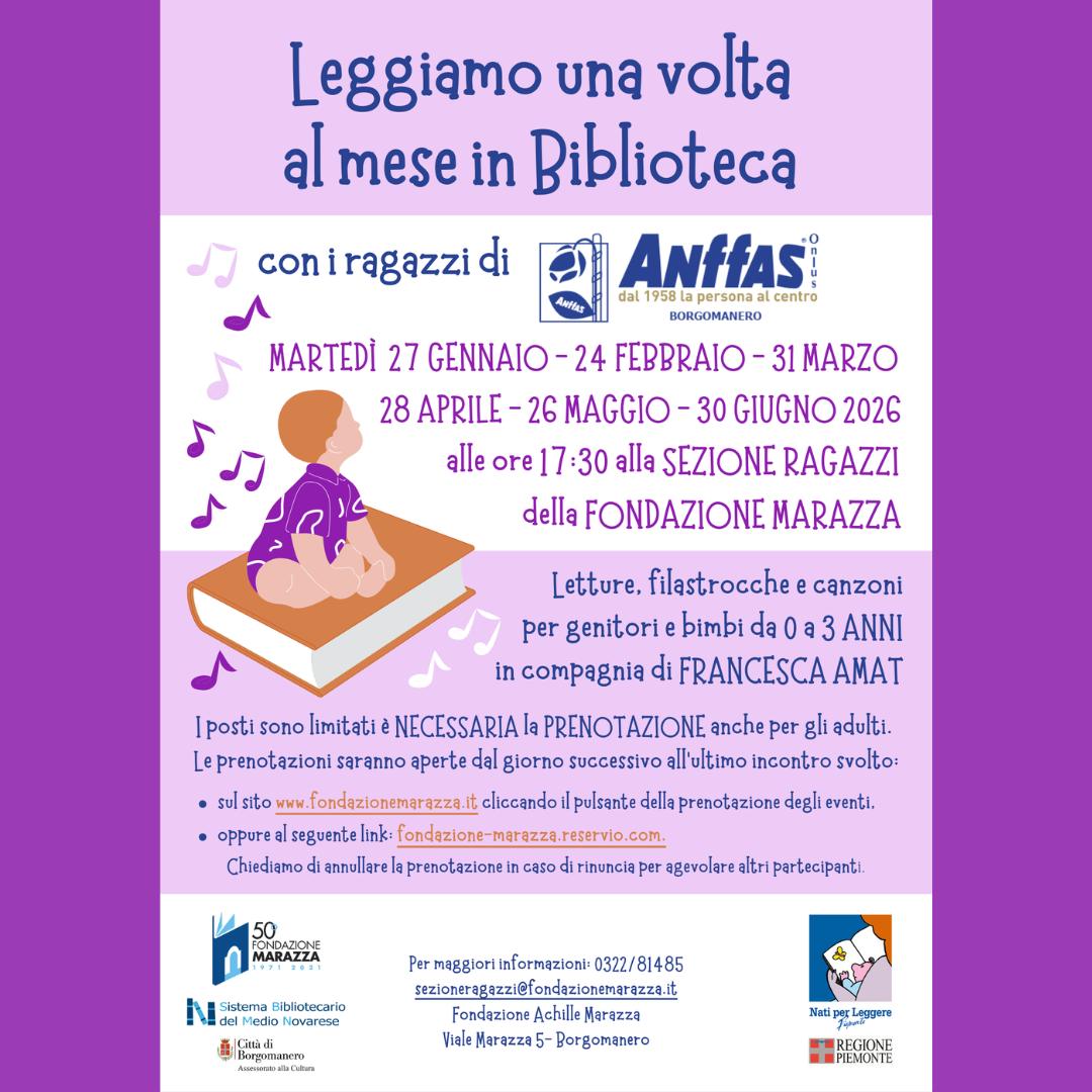 Prosegue con successo, nei locali della sezione ragazzi della Fondazione Marazza, il progetto "Leggiamo in Biblioteca - Una volta al mese", il ciclo di letture rivolto a bambini da 0 a 3 anni e alle loro famiglie con i ragazzi e le ragazze di Anffas Borgomanero, guidati da Francesca Amat, autrice ed esperta di letteratura per l’infanzia. Un appuntamento dedicato alla condivisione di letture, filastrocche e canzoni.